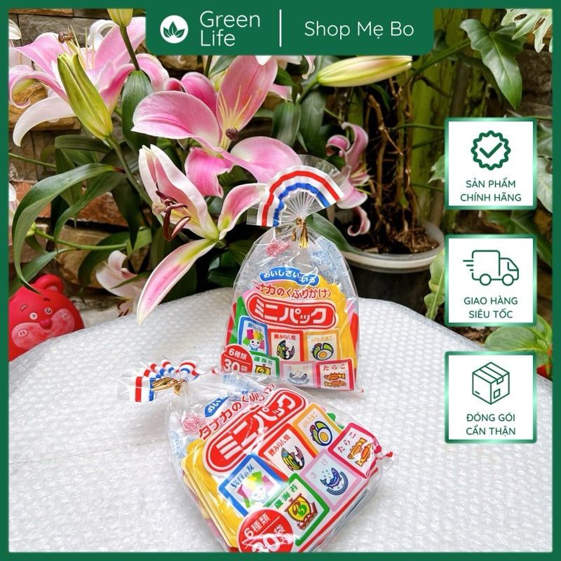 Rắc cơm Mini Packets 30 gói gồm 6 loại thơm ngon: Cá thu rong biển, Cá ngừ nướng Mirin, Trứng rong biển, Rong biển, Cá hồi, Trứng cá tuyết.