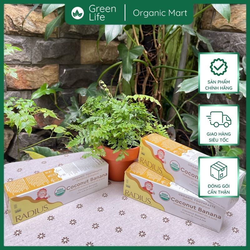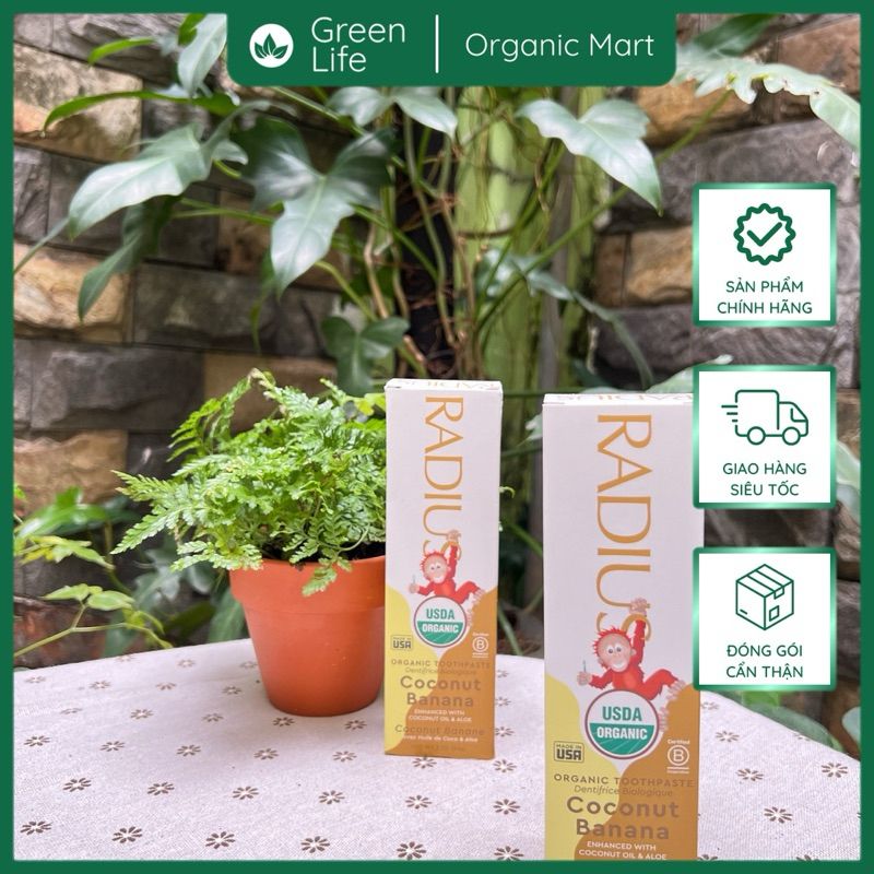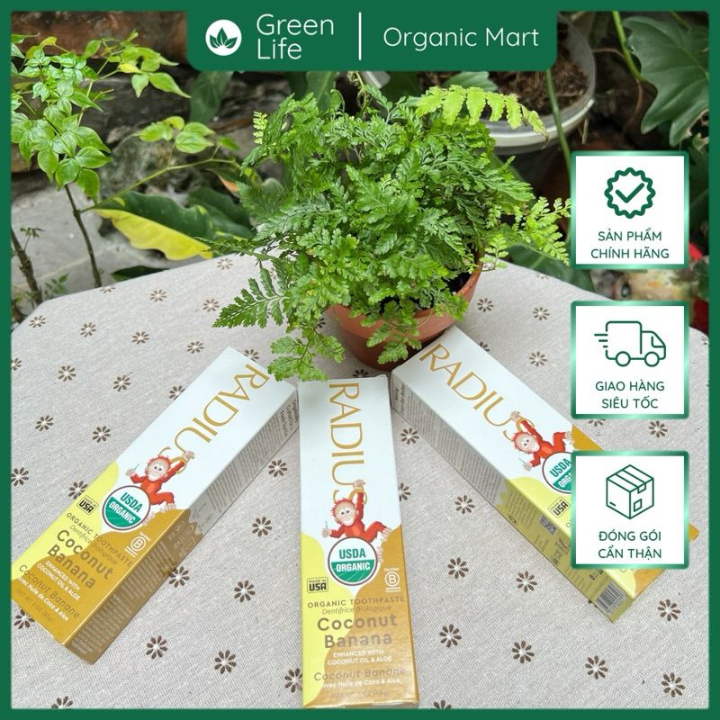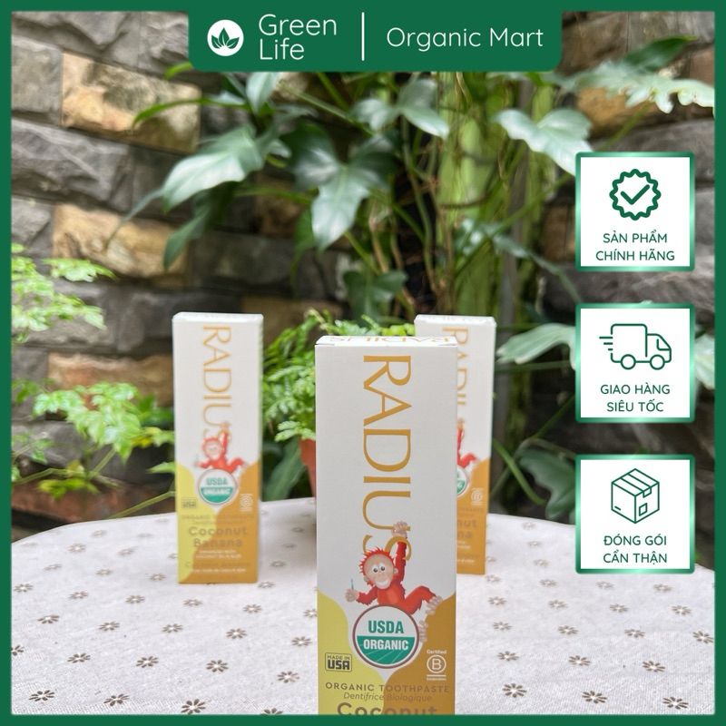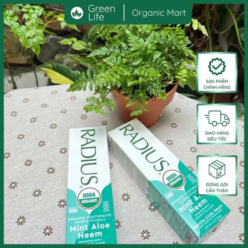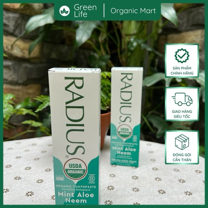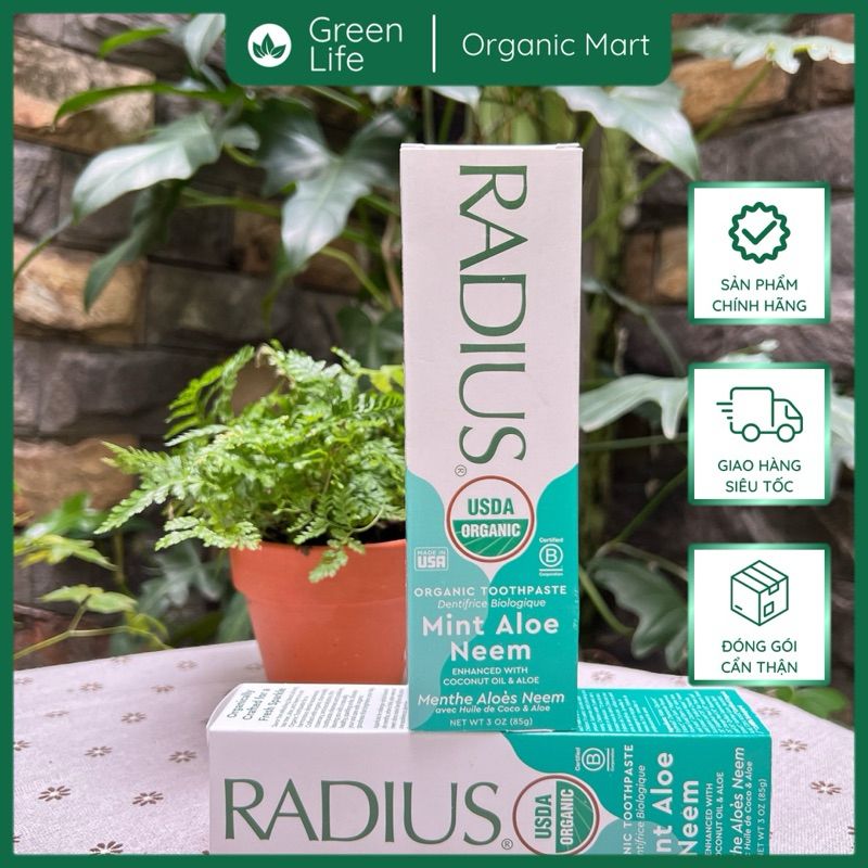 Kết quả là cho ra đời loai kem đánh răng an toàn tuyệt đối kể cả khi nuốt. Một công thức không chứa bất kỳ hóa chất độc hại nào, như chất tạo bọt nhân tạo (SLS & SLEs), fluoride, chất tẩy rửa, chất làm ngọt nhân tạo, chất phụ gia, chất biến đổi gen (GMOs) và chất tạo độ kết dính (glutens) thường được sử dụng trong kem đánh răng thông thường để đồng nhất hương vị và kết cấu kem. Điểm đáng chú ý trong kem đánh răng hữu cơ RADIUS là an toàn và hiệu quả triệt để.