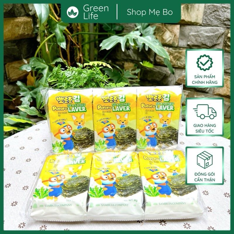 - Thành phần chính của món Rong biển ăn liền Pororo là rong biển tự nhiên được khai thác 100% từ đại dương nên rất sạch an toàn cho trẻ.